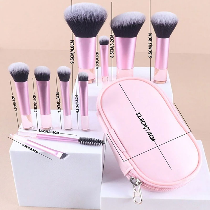 این ست براش مینی شامل 10 عدد براش کاربردی است. این براش‌ها سایز کوچکی دارند و شما می‌توانید برای استفاده روزانه و مهمانی از آن‌ها استفاده کنید. اما نکته قابل اهمیت این است که این براش شین به اندازه کف دست و قابل حمل است. شما می‌توانید این براش‌ها را در کیف قرار دهید و به مهمانی بروید؛ همچنین می‌توانید بار چمدانتان را سبک‌تر کنید و سفری لذت‌بخش را تجربه کنید.